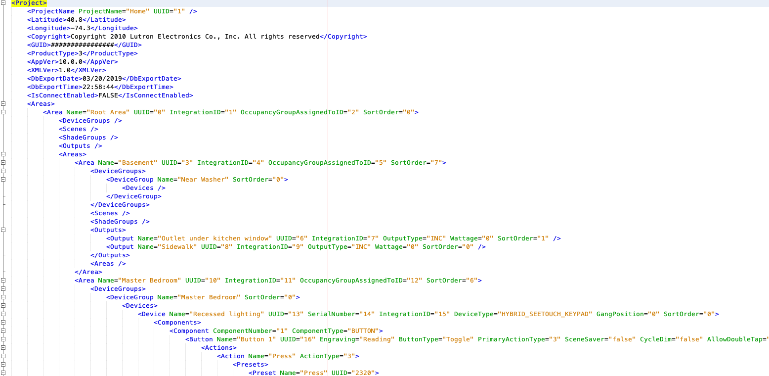 Integrating, therefore, is a matter of parsing the XML to find the Area Names, which in a Radio RA/2 implementation, are the various rooms in the house. Each Area, has Devices, Shades and Outputs. Some devices are simple, like the outputs which have an OutputType of INC which is a dimmer for incandescent lighting. Other output types, such as AUTO_DETECT are dimmers that are capable of dimming LED and low voltage lighting that uses either magnetic or electronic transformers.